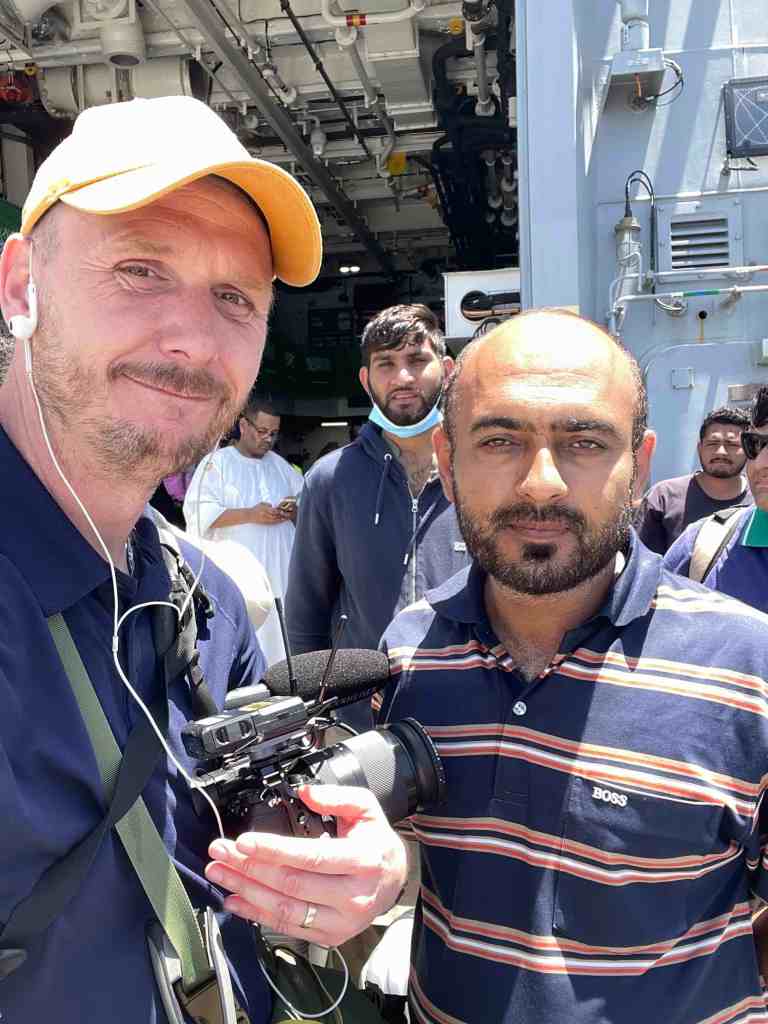 Muhammed is just behind me and I swing around to film him as he clambers onto the deck.