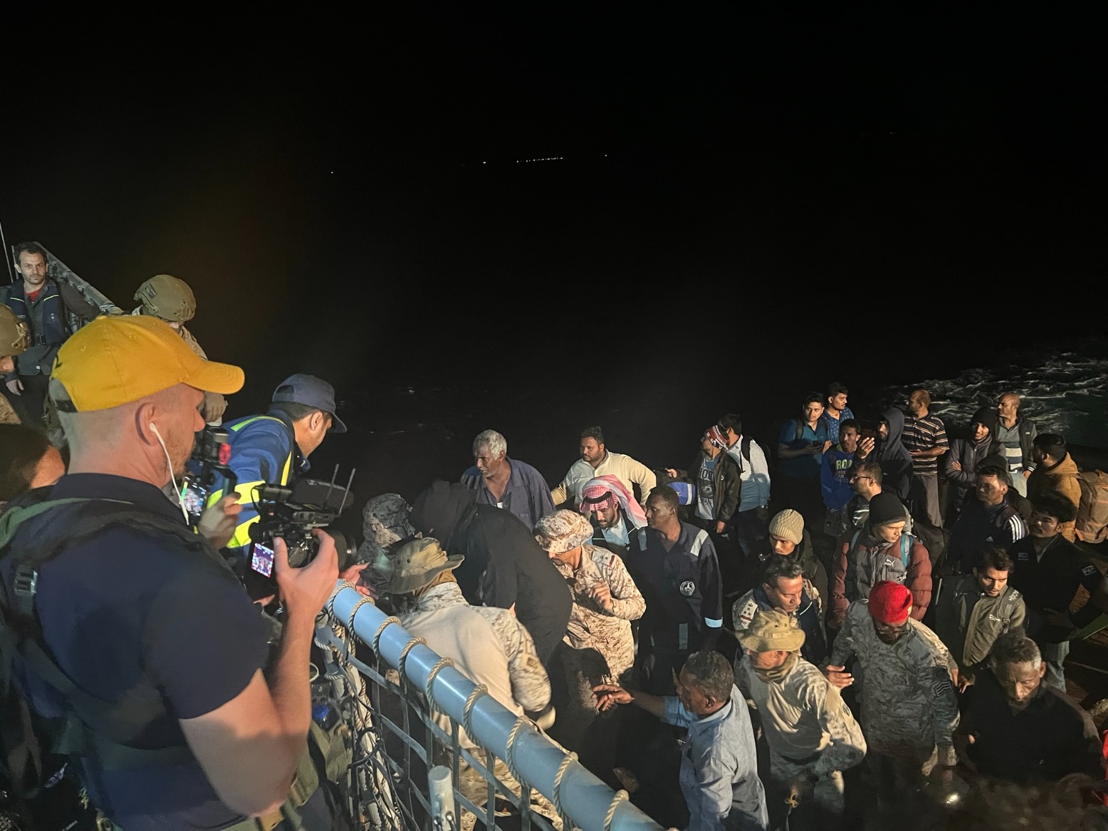 The tug boat heads back out to sea where we rendezvous with the Saudi Arabian Navy corvette. It’s a tough job to pull the two ships side-by-side. There is a lot of shouting and gesticulating.